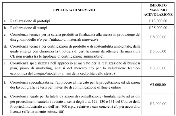 L'impresa può chiedere l'agevolazione per le spese sostenute per l'acquisto di servizi specialistici esterni funzionali al progetto di valorizzazione. Di seguito tipologia servizio e importo massimo agevolazione per ogni tipologia: